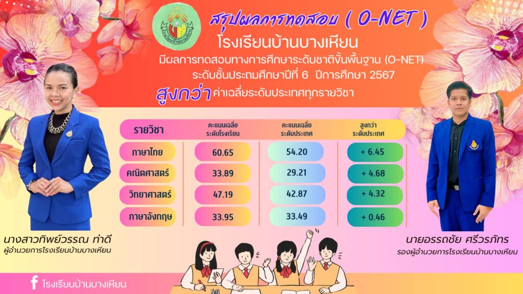 นอกจากนี้ โรงเรียนบ้านบางเหียน มีความยินดีเป็นอย่างยิ่งที่จะแจ้งให้ทราบว่า ผลการทดสอบทางการศึกษาระดับชาติขั้นพื้นฐาน (O-NET) ของนักเรียนชั้นประถมศึกษาปีที่ 6 โรงเรียนบ้านบางเหียนในปีนี้ มีคะแนนเฉลี่ยสูงกว่าระดับประเทศในทุกวิชา ซึ่งเป็นเครื่องยืนยันถึงศักยภาพทางวิชาการของนักเรียน และความทุ่มเทของคณะครูในการพัฒนาคุณภาพการศึกษาอย่างต่อเนื่อง