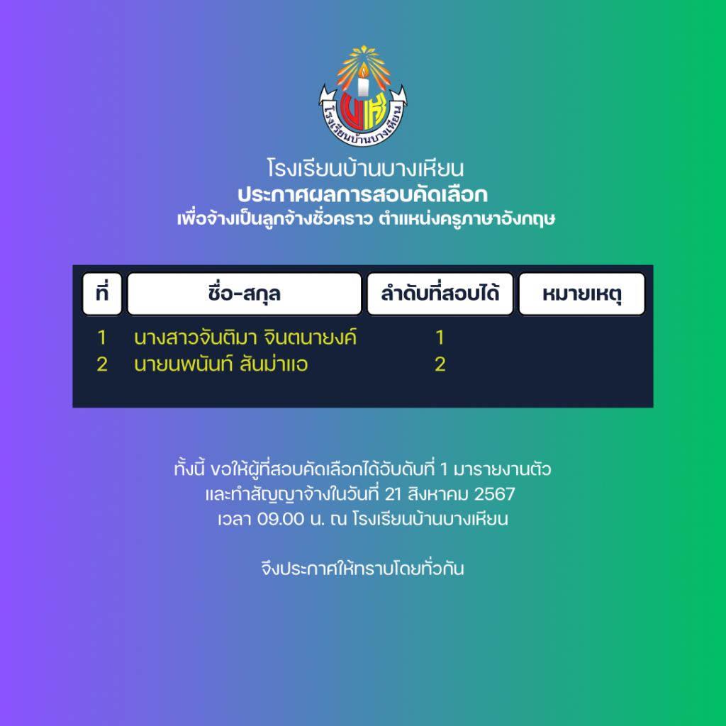 ขอแสดงความยินดีกับ นางสาวจันติมา จินตนายงค์ ที่สอบคัดเลือกได้อันดับที่ 1 และนายนพนันท์ สันม่าแอ ที่มีชื่อเป็นสำรองลำดับที่ 1 ขอให้ผู้ที่สอบคัดเลือกได้อันดับที่ 1 มารายงานตัวในวันที่ 21 สิงหาคม 2567 เว