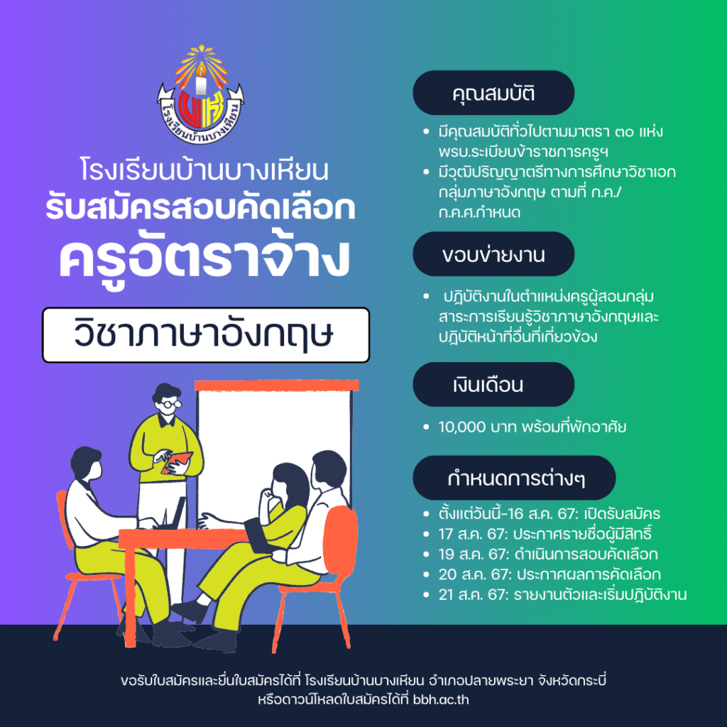โรงเรียนบ้านบางเหียน ประกาศรับสมัครครูภาษาอังกฤษ โรงเรียนบ้านบางเหียน อำเภอปลายพระยา จังหวัดกระบี่ สังกัดสำนักงานเขตพื้นที่การศึกษาประถมศึกษากระบี่ เปิดรับสมัครบุคคลทั่วไปเพื่อเข้าร่วมโครงการพัฒนาการใ
